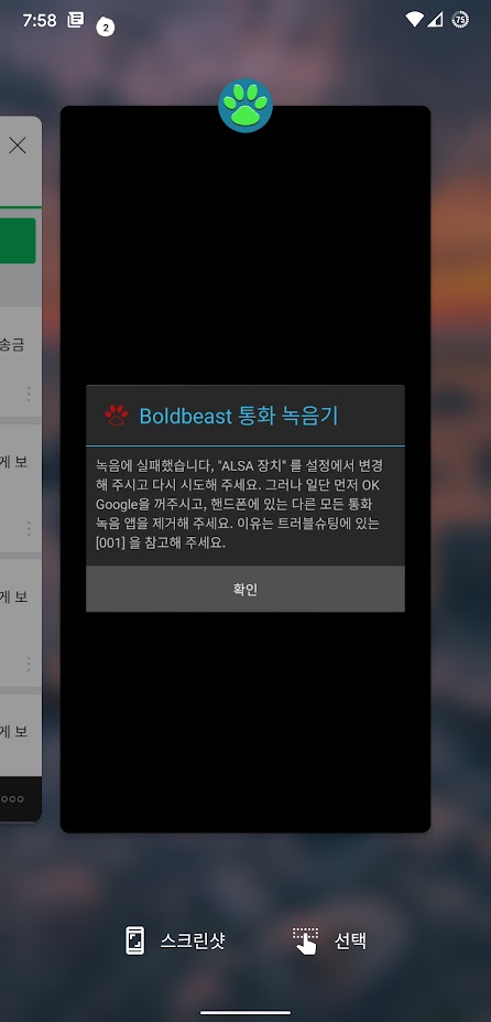 스크린샷은 말 그대로 앱 스크린샷을 찍는 것이고 선택은 앱에 보이는 글자를 선택할 수 있는 기능입니다.