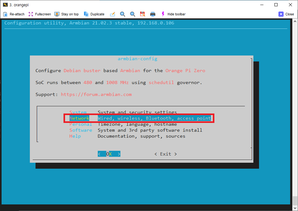 상기와 같이 제대로 동작하는게 확인이 되셨다면, armbian-config 메뉴를 통해 와이파이를 연결하고 설정을 진행합니다.