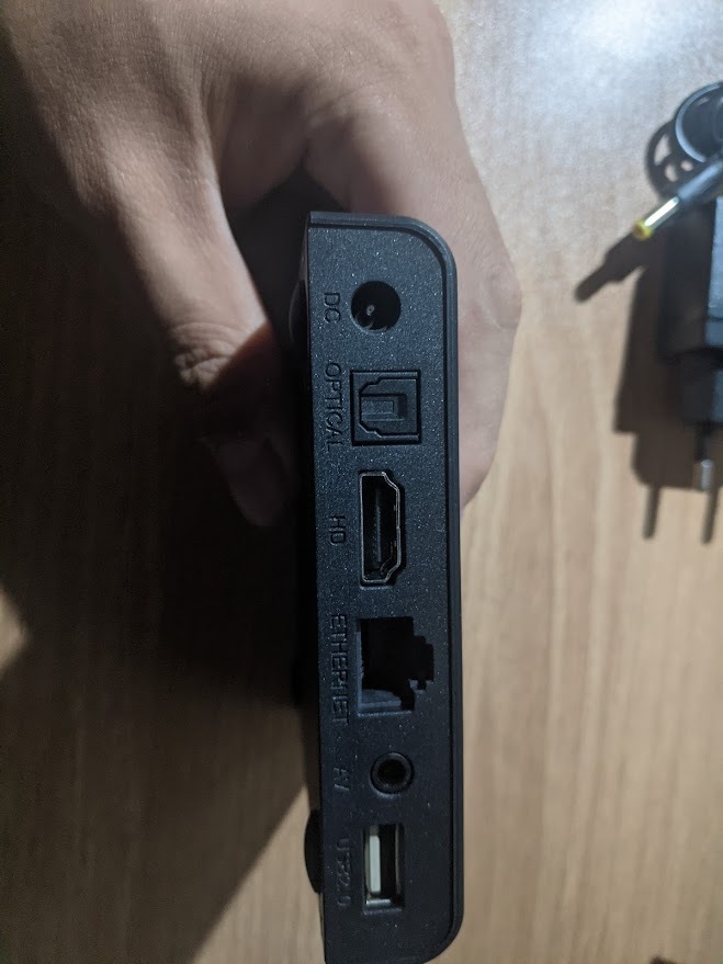 후면에 DC어댑터 단자 / 광출력 / HDMI 포트 / ETHERNET 포트 / AV (CVBS) / USB2.0 포트가 있습니다.