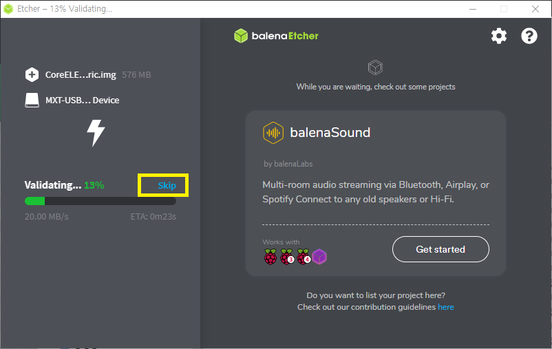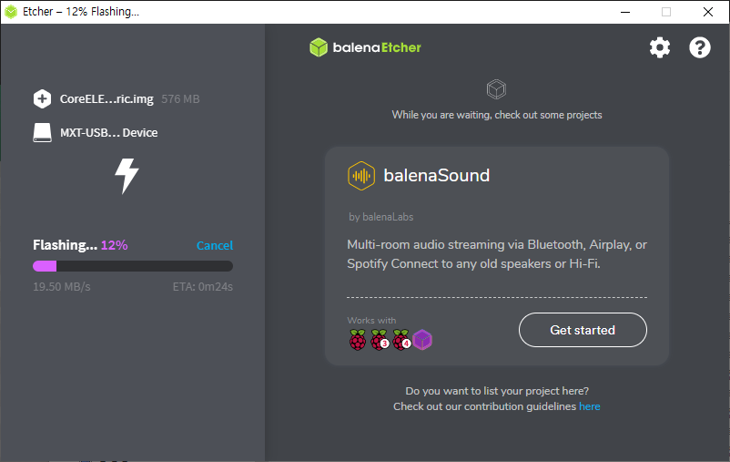 이 이미지를 etcher 로 SD카드에 다운로드 합니다. (일종의 dd 라고 보시면 됩니다.)