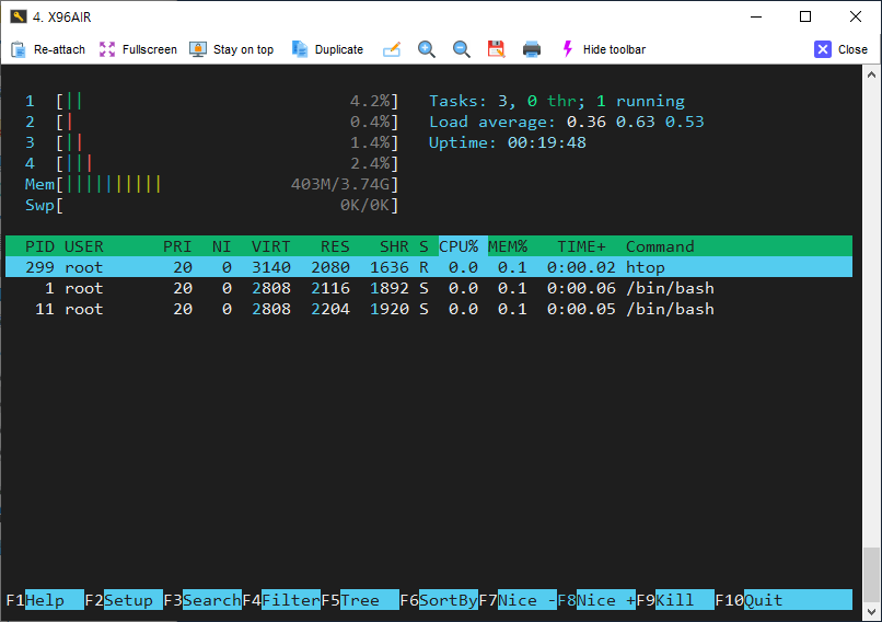 htop 으로 자원 상태를 확인해 보았습니다. 하기와 같이 CoreELEC 가 돌아가고 있어서 램 용량에 약간 손해가 있지만,