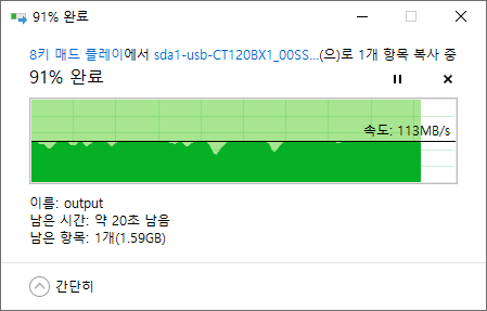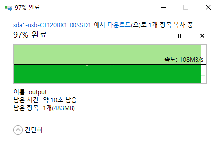 ??? USB3.0 외장 SSD 인데 대략18기가짜리를 복사했는데 중간 중간 흔들리는 모습을 보여주지만 대부분 100MB/s 이상을 보여줍니다.