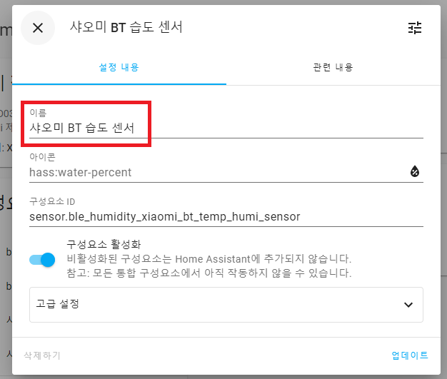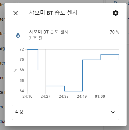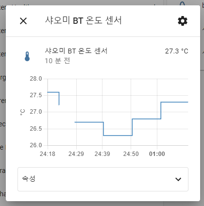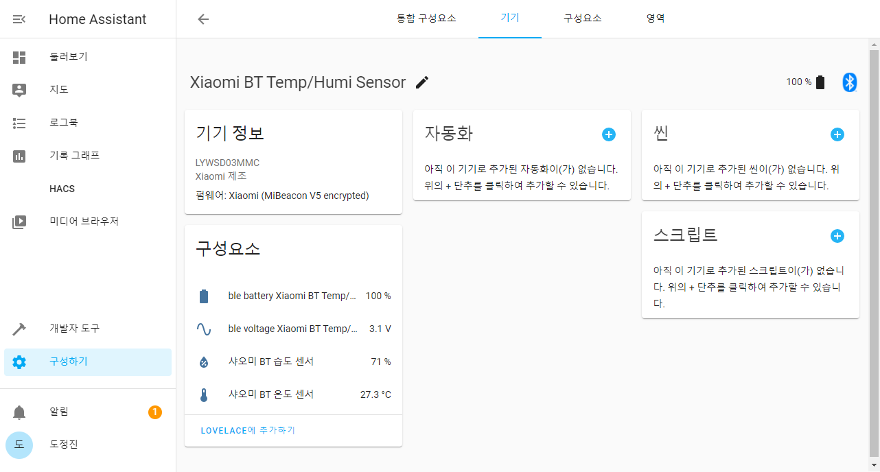 이 BT 온도 센서는 커펌을 하기 전에는 리포팅 주기가 10분입니다. 따라서 바로 HA 장치목록에 올라오지 않을 수 있습니다. 조금 기다리면 하기와 같이 통합구성요소에 올라옵니다.