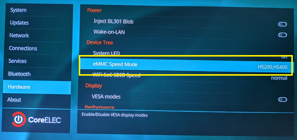 HS200으로 나오네요. CoreELEC 설정에 HS400을 쓸 수 있으면 쓰는 모드가 있어서 활성화 해보고 다시 찍어보았습니다.
