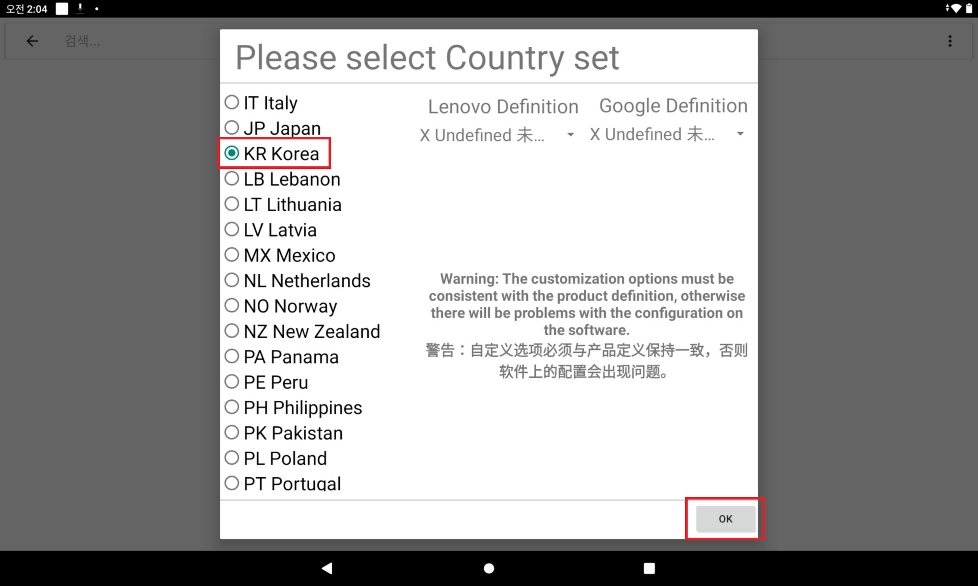 그러면 하기와 같은 창이 뜨고 KR 을 눌러주신다음 OK 를 누르시면 됩니다.