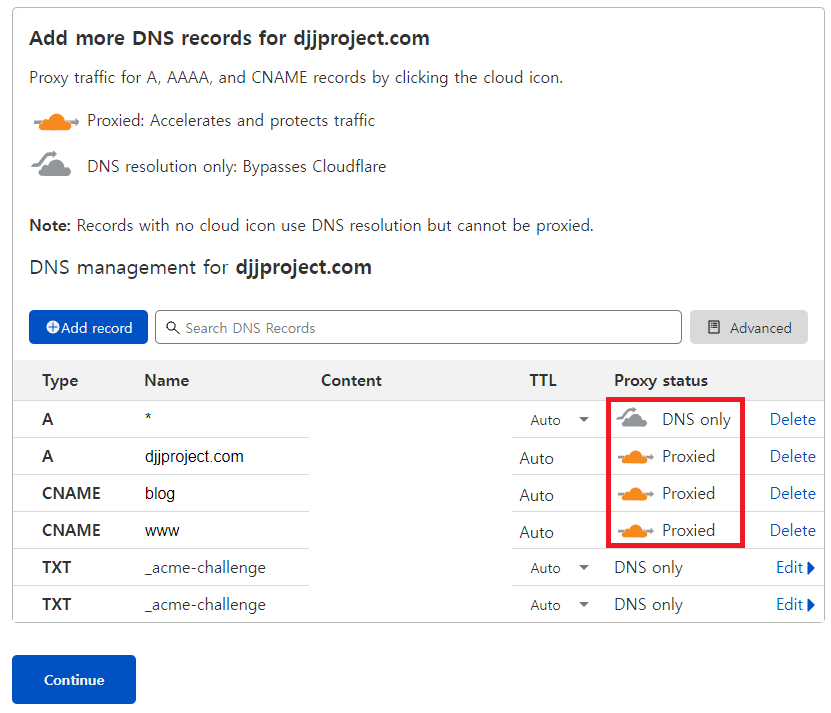 조회가 완료되면 하기와 같이 표시가 됩니다. 이때 Proxy 를 활성화 하면 요금을 낼 수 있음으로 그냥 DNS Only 로 설정합니다.