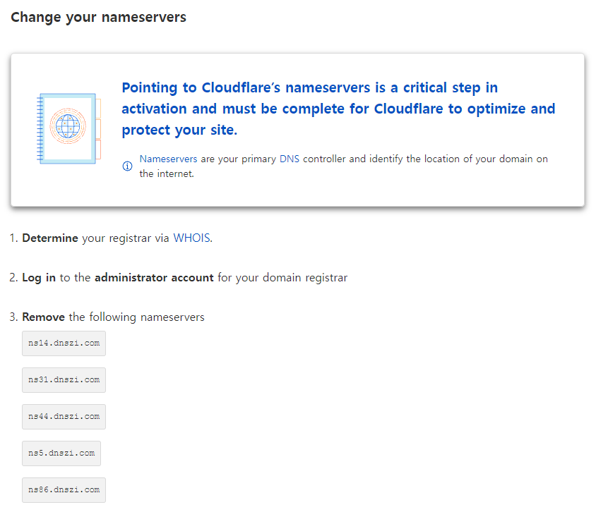 1번에서 다음으로 넘어가면 네임서버를 변경하라고 나옵니다.