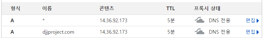 | root@debian:~/ddclient-3.9.1# vi /etc/ddclient.conf # 프로토콜 설정 protocol=cloudflare # 존 설정 (사이트 도메인) zone=djjproject.com # Cloudflare 아이디 입력 login=djj9405@naver.com # Cloudflare API 키 입력 password= # 설정 도메인 입력 (콤마로 구분) # 저는 와일드 카드 까지 등록을 해보았습니다. djjproject.com,*.djjproject.com |