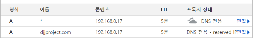 | root@debian:~/ddclient-3.9.1# vi /etc/ddclient.conf # 프로토콜 설정 protocol=cloudflare # 존 설정 (사이트 도메인) zone=djjproject.com # Cloudflare 아이디 입력 login=djj9405@naver.com # Cloudflare API 키 입력 password= # 설정 도메인 입력 (콤마로 구분) # 저는 와일드 카드 까지 등록을 해보았습니다. djjproject.com,*.djjproject.com |
