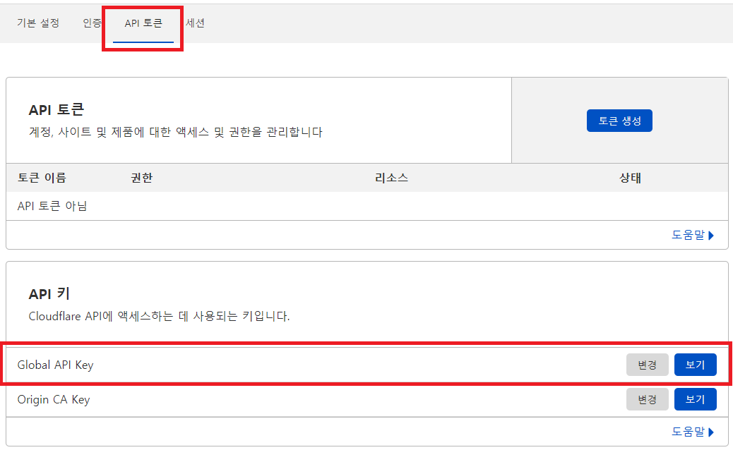 DNS만 사용을 하고 있음으로 상기 API 토큰을 생성하지 않고 글로벌 키를 통해 설정을 해보겠습니다.