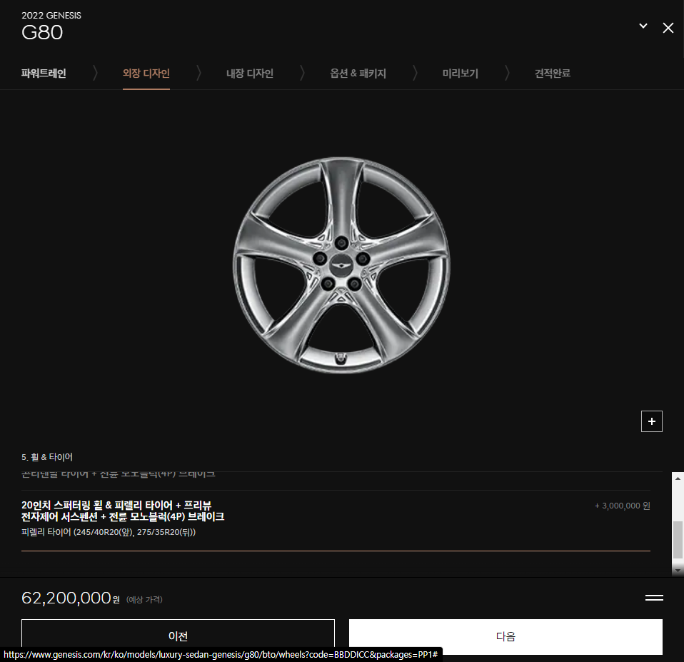 그리고 휠에 대한 이야기를 빼먹었는데요. 되도록이면 저는 18인치나 20인치를 선택할 예정이였습니다. 그런데 가격이 너무 사악해서 18인치를 선택하게 되었습니다.