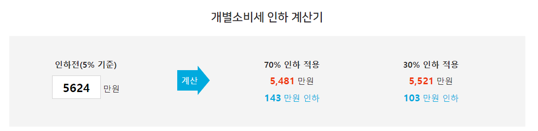 (차량 금액 - 5프로 할인) 의 개소세 할인 : 103만원