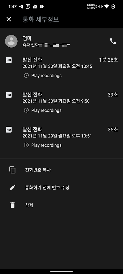 통화 기록에서 녹음을 들으실 수 있고, 파일은 sdcard/music/call_recording 에 저장됩니다.