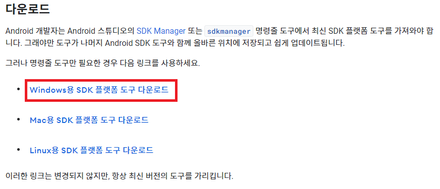 https://developer.android.com/studio/releases/platform-tools?hl=ko