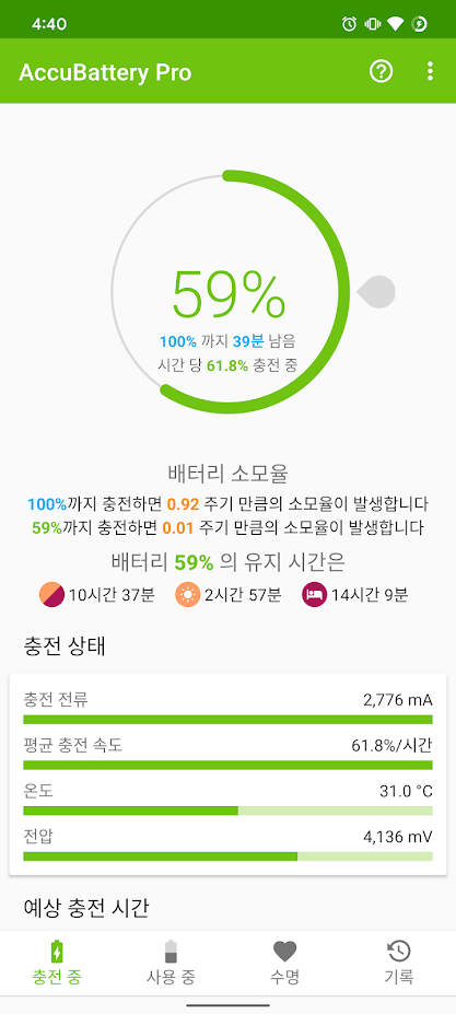 화면 켜짐으로 라이트하게 사용 시, 14시간 정도 예상됩니다.