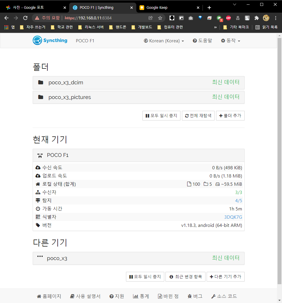 상기 3개가 동기화 하기 위해서 Syncthing을 사용합니다. 다른 곳들을 찾아보면 구글 포토 앱에 대해서 매크로를 거는 경우가 많은데요. 실제로 매크로 없이도 정상적인 방법으로 운용에 크게 문제가 없었습니다.
