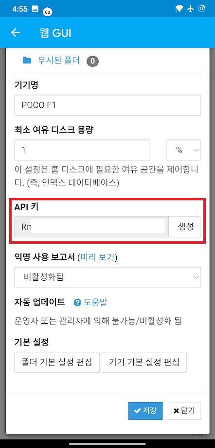 이때 아이디 비번은 syncthing / api key 라고 하네요.