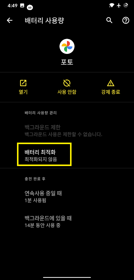 마찬가지로 구글 포토도 배터리 최적화에서 제외시킵니다.