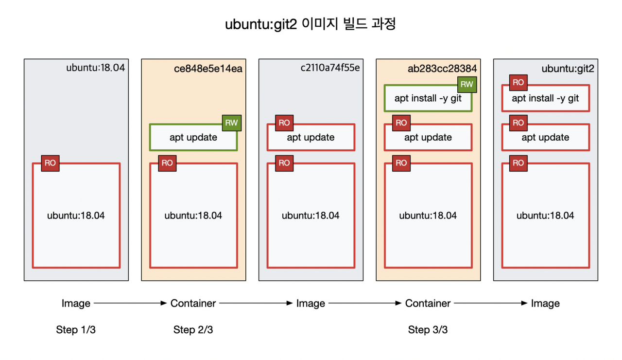 Dockerfile 의 명령들을 하나 하나 실행할 때마다, 레이어가 생기는 구조이고, 이는 그래프 드라이버를 통해 (모듈은 overlayfs) 등으로 합쳐집니다.