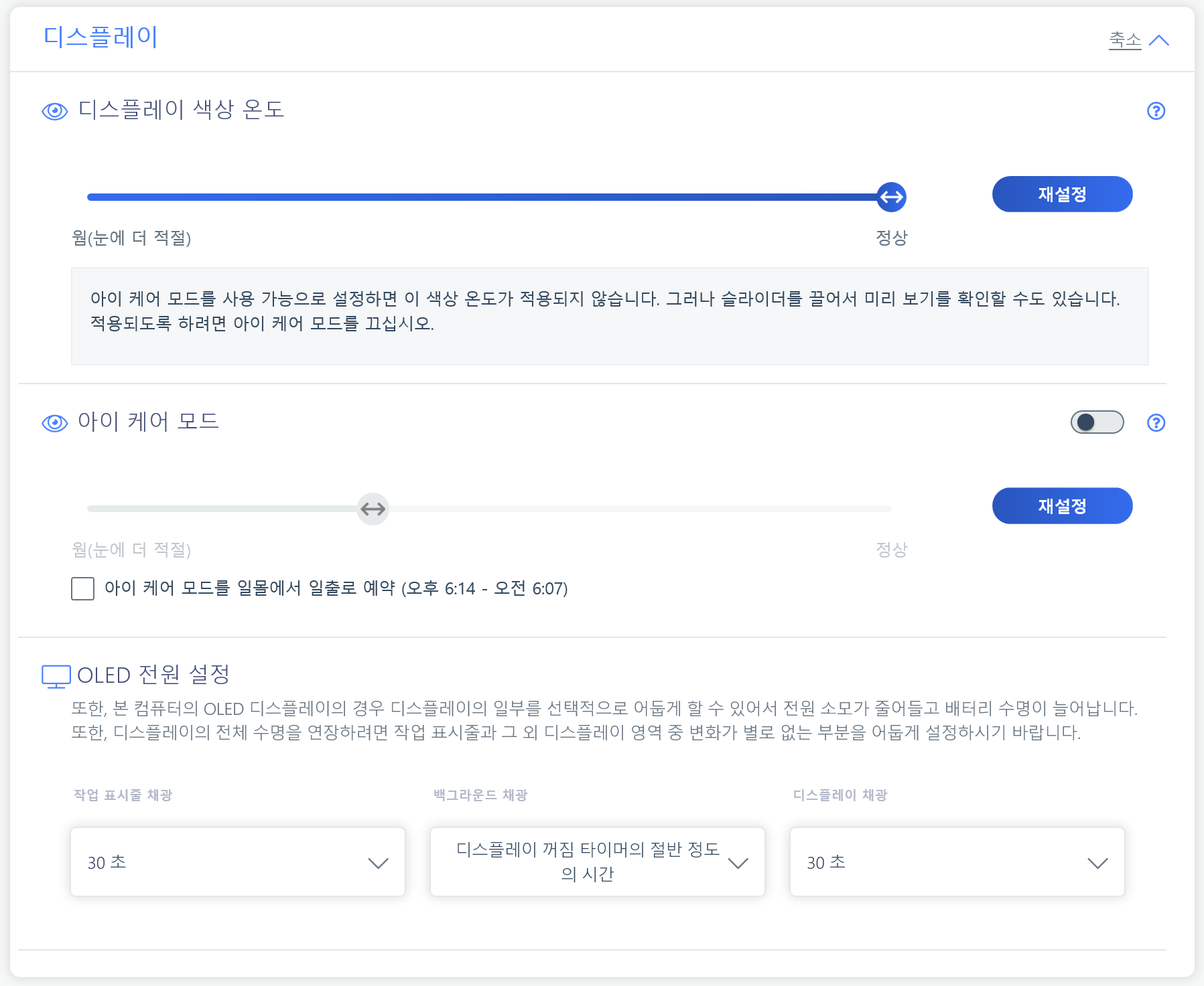 디스플레이는 온도와 밝기 OLED 번인 및 전원 절약등이 설정가능합니다.