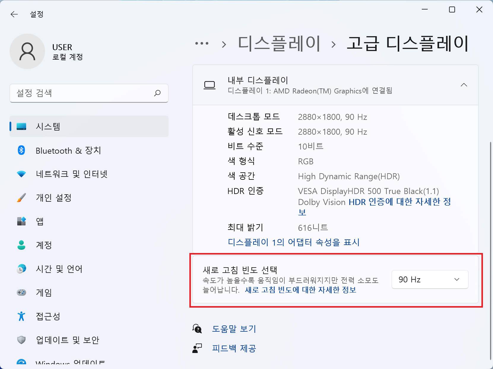 그리고 90Hz 까지 화면 주사율 설정이 가능합니다. 144프레임 맛을 이미 봐서 조금 떨어지는 것 같지만 나름 부드럽게 작동합니다.