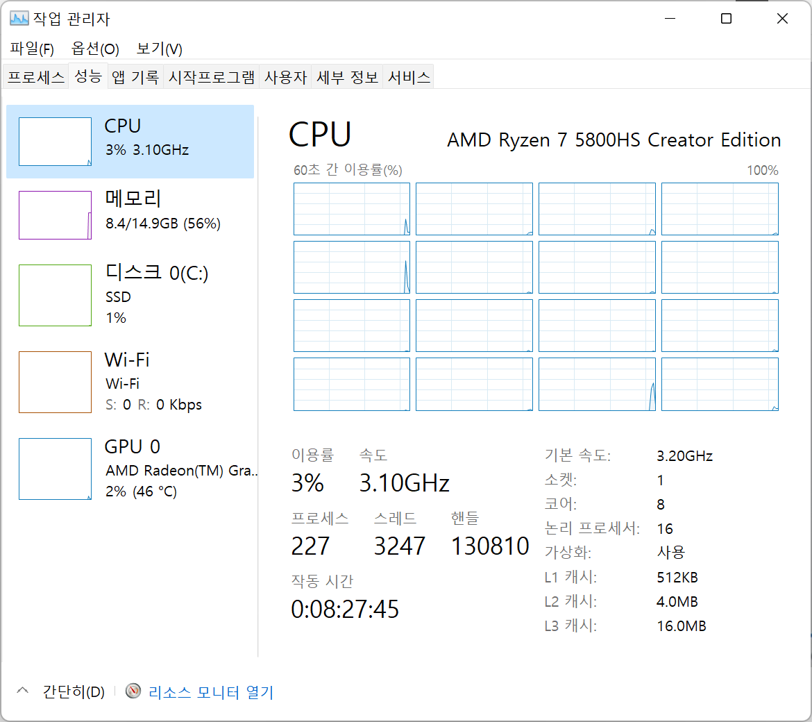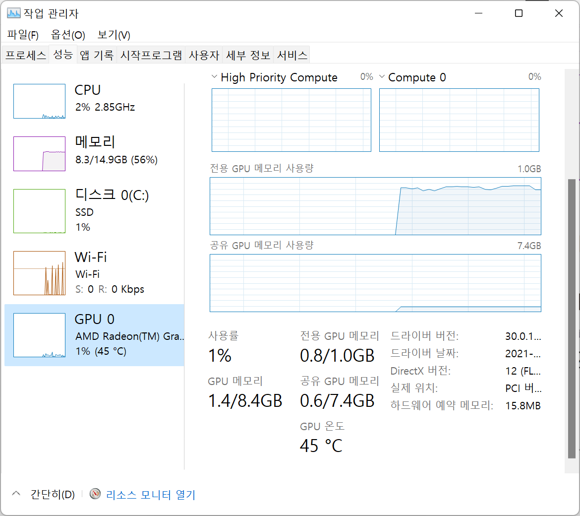 저는 외장을 끈 상태라서 MX450 은 보이지 않습니다.