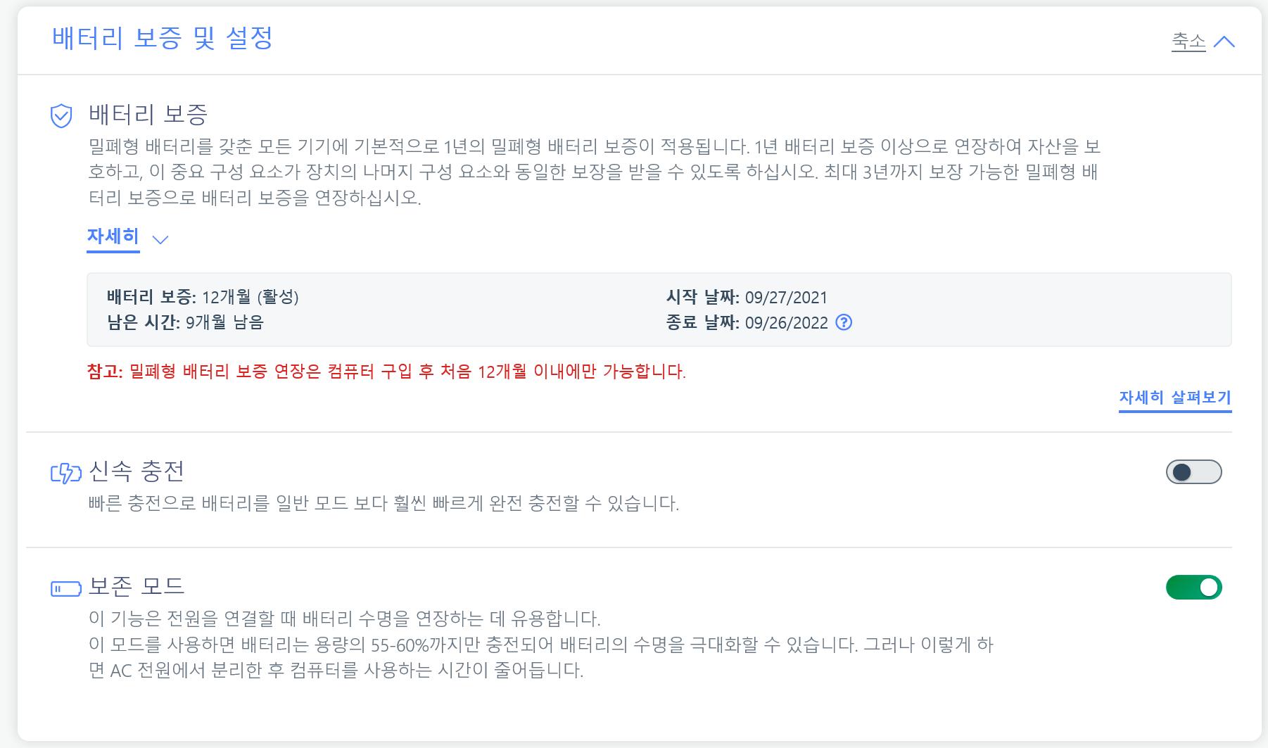 배터리 모드 설정이 조금 마음에 들었는데요. 보존모드라는 것이 있어서 충전이 안되도록 설정이 가능합니다. 딱히 밖에 나갈일이 없으면 그냥 보존모드로 해두는 편입니다.