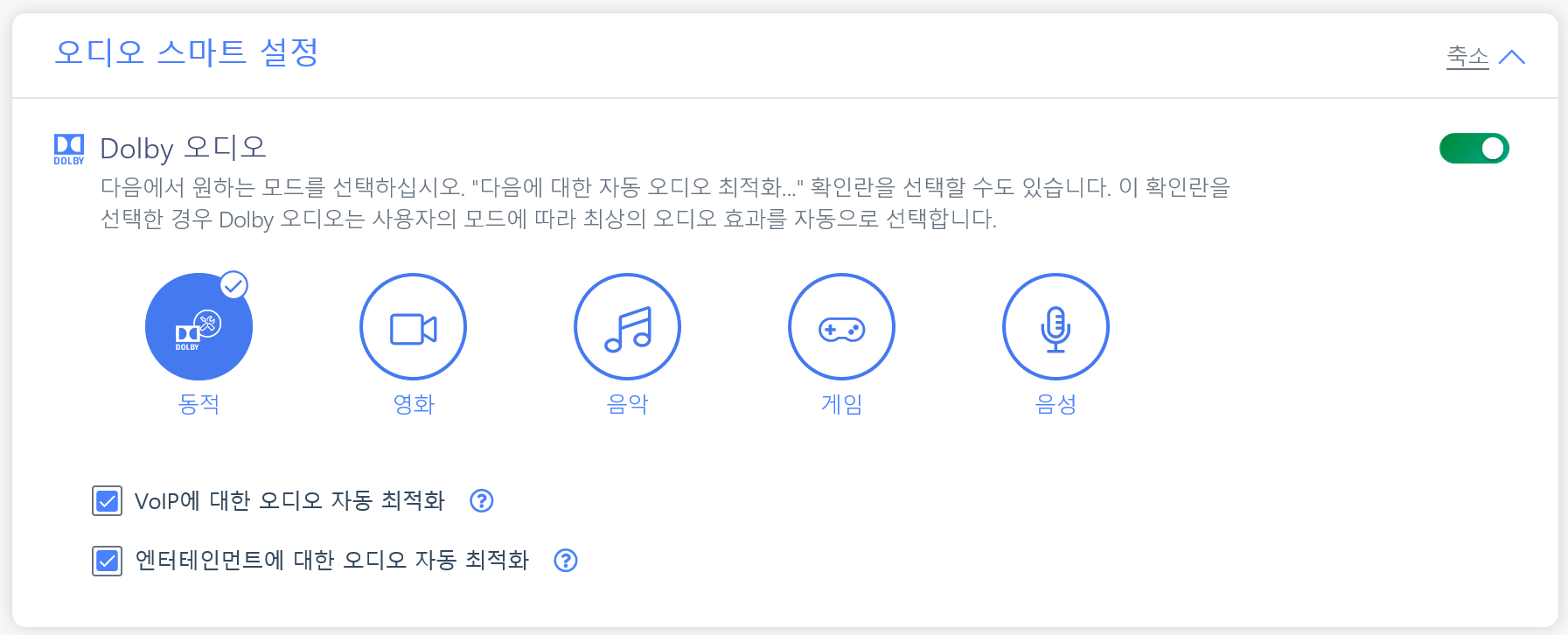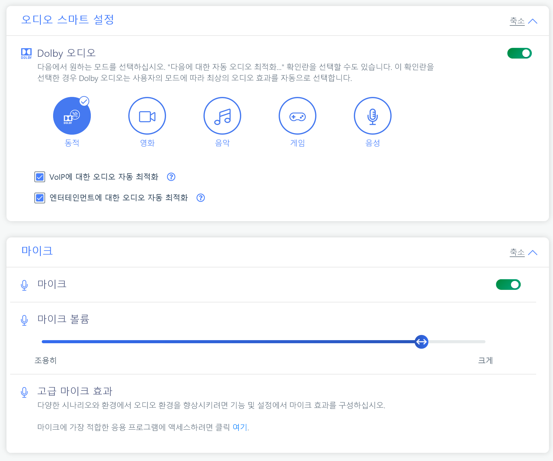 돌비 설정과 마이크 설정이 있는데요. 별 할 수 있는 설정은 없는 것 같습니다.
