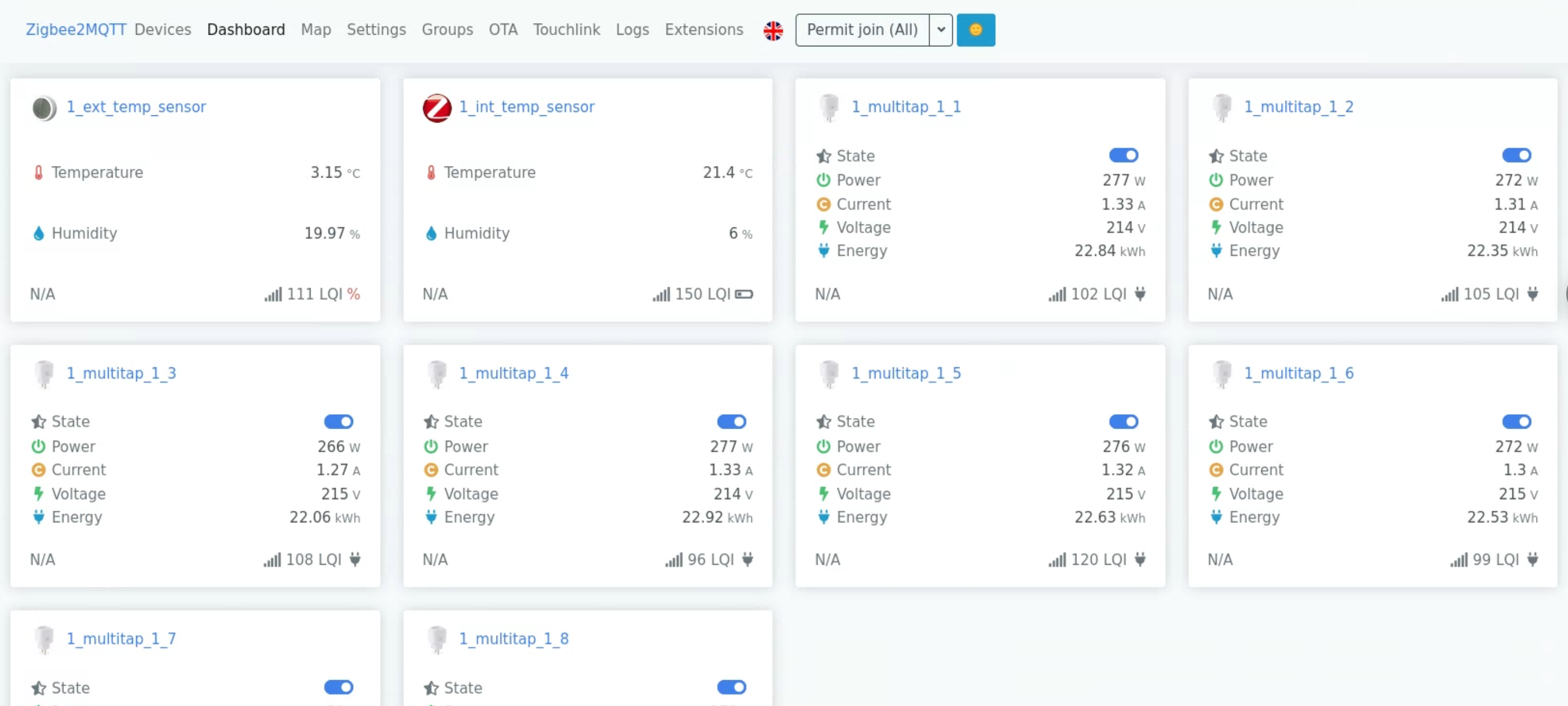 아래는 B장소의 온도센서2개와, A장소 온도센서2개 그리고 스마트플러그 8개가 한곳에 연동된 모습입니다.