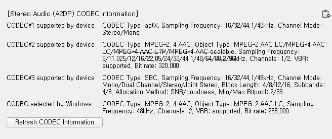 인텔 블루투스는 오래된 장비라도 드라이버 업데이트 하면 aptX가 된다고 하는데 묻지마 꽃게택은 AAC까지인거 같습니다.