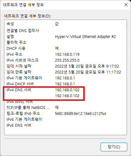윈도우 컴퓨터에서 DNS 주소를 받아온것을 확인해보면 정상적으로 설정이 되었음을 알 수 있습니다.