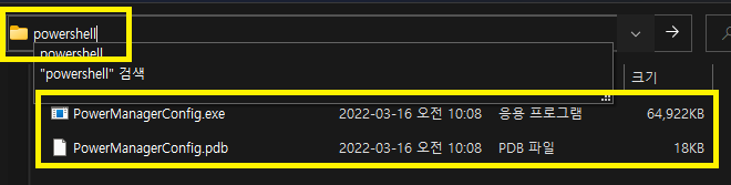 PowerManagerConfig 파일을 받고 압축을 푼 다음 주소창에 powershell 이라고 입력하여 powershell 을 실행합니다.