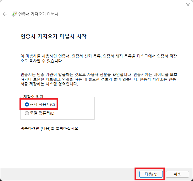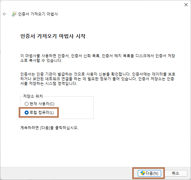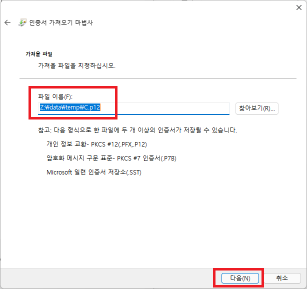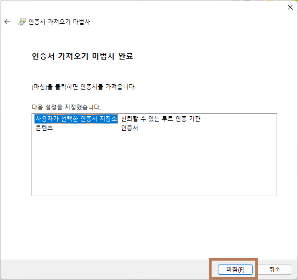 인증서를 윈도우에서 아래와 같이 등록합니다.