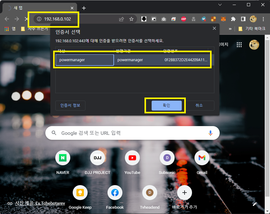 주소를 입력하는 순간 443으로 이동되며, 인증서 선택창이 뜹니다.