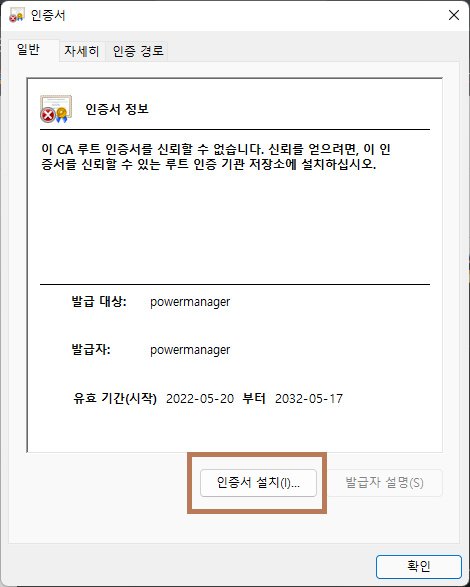 인증서를 윈도우에서 아래와 같이 등록합니다.