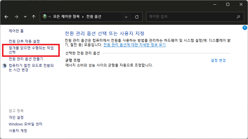 일단 제어판에서 아래에 덮개를 닫을 때 설정을 변경하여 절전모드로 들어가지 않도록 합니다.