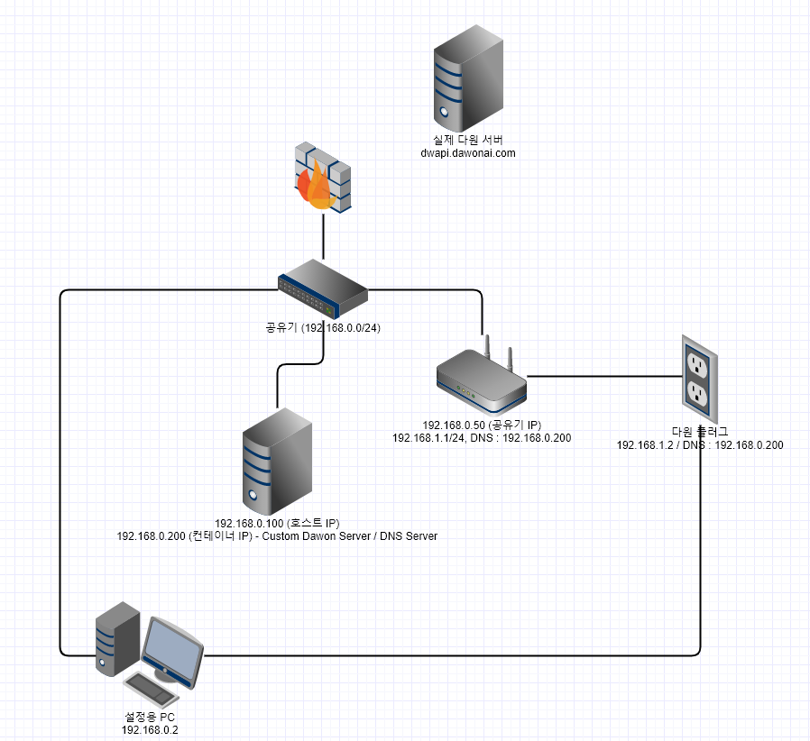 이때 설정값은 AP 가 192.168.1.1 로 할당되어 있는 하위 공유기로 연결하게 되고, 하위 공유기는 Custom Dawon Server 가 설치된 192.168.0.200 의 DNS 값을 가지고 있습니다.