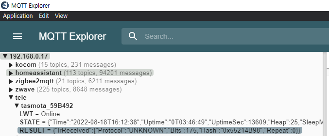 그럼 센서를 하나 생성해서 tele/tasmota_59B492/result 를 보면 되겠네요.