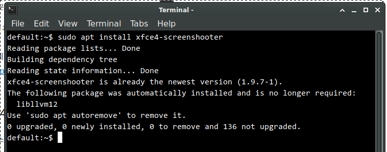 | default:~$ sudo apt install xfce4-screenshooter Reading package lists... Done Building dependency tree Reading state information... Done xfce4-screenshooter is already the newest version (1.9.7-1). The following package was automatically installed and is no longer required: libllvm12 Use 'sudo apt autoremove' to remove it. 0 upgraded, 0 newly installed, 0 to remove and 136 not upgraded. |