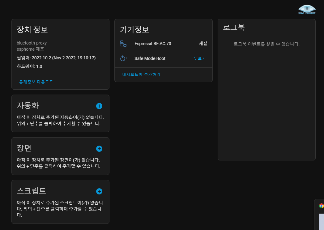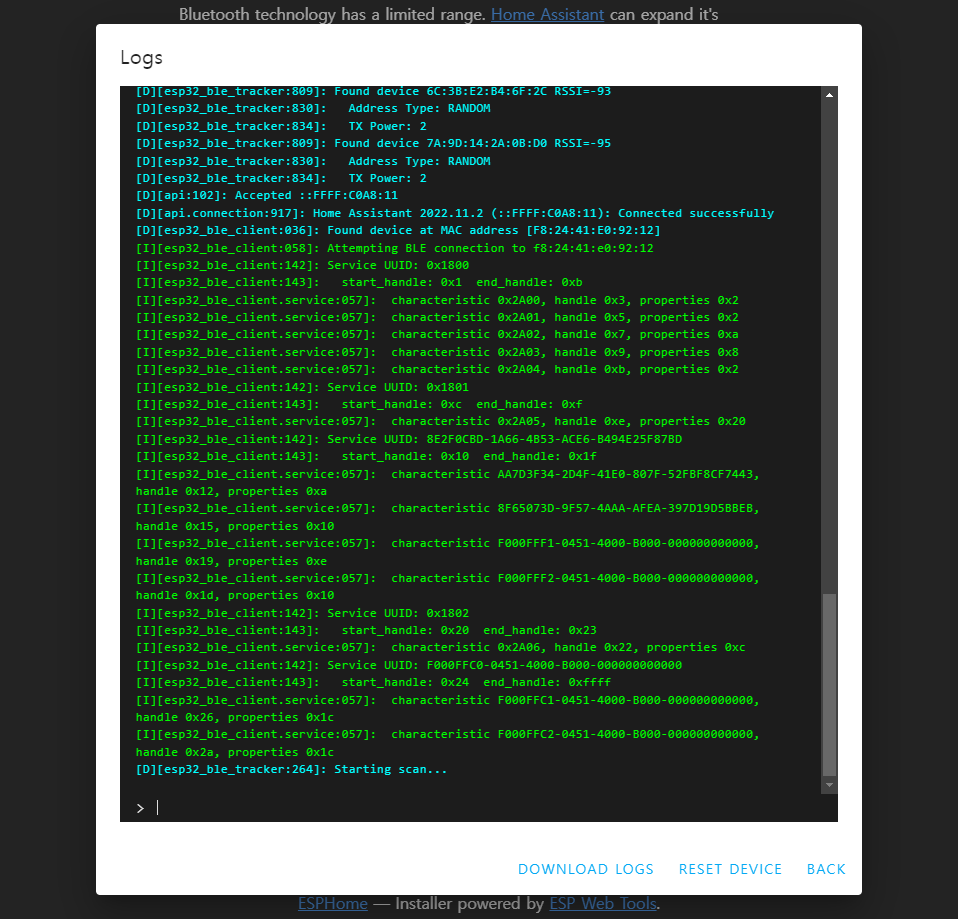 혹시나 해서 물리 BT 모듈 드라이버를 제거하고 해도 잘 작동하여, 궁금해서 ESPHOME 로그를 확인해 보았습니다.