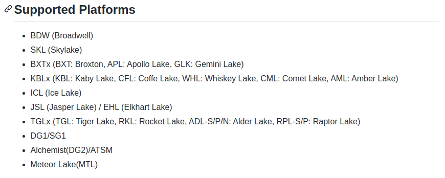 한편 11세대 내장 GPU는 제스퍼레이크이며 intel-media-dirver 페이지에 TGLx에 해당합니다.