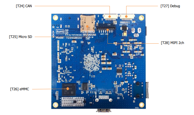 SD카드 슬롯 그리고 EMMC / MIPI 2lane / CAN 단자와 UART JTAG 연결 단자가 있습니다.