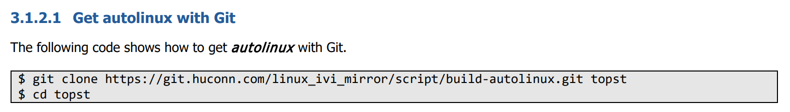 | djjproject@DESKTOP-D254630:~/topst$ git clone https://git.huconn.com/linux_ivi_mirror/script/build-autolinux.git djjproject@DESKTOP-D254630:~/topst/build-autolinux$ ls README autolinux classes doc script template |
