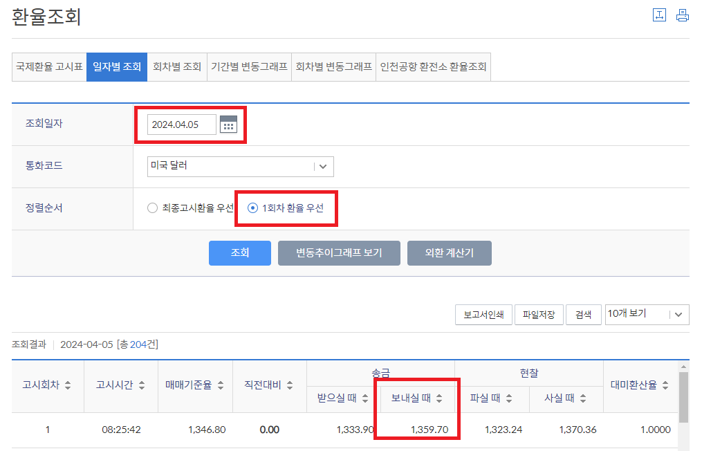 필요한 값은 위 환율 페이지에서 아래 1회차 고시환율의 송금 보낼때 환율입니다.
