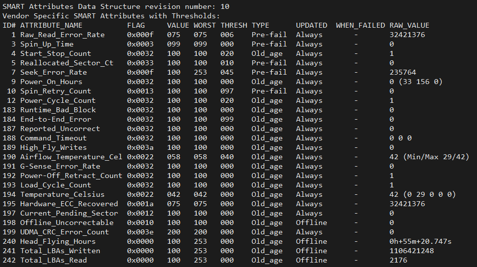 | SMART Attributes Data Structure revision number: 10 Vendor Specific SMART Attributes with Thresholds: ID# ATTRIBUTE_NAME FLAG VALUE WORST THRESH TYPE UPDATED WHEN_FAILED RAW_VALUE 1 Raw_Read_Error_Rate 0x000f 075 075 006 Pre-fail Always - 32421376 3 Spin_Up_Time 0x0003 099 099 000 Pre-fail Always - 0 4 Start_Stop_Count 0x0032 100 100 020 Old_age Always - 1 5 Reallocated_Sector_Ct 0x0033 100 100 010 Pre-fail Always - 0 7 Seek_Error_Rate 0x000f 100 253 045 Pre-fail Always - 235764 9 Power_On_Hours 0x0032 100 100 000 Old_age Always - 0 (33 156 0) 10 Spin_Retry_Count 0x0013 100 100 097 Pre-fail Always - 0 12 Power_Cycle_Count 0x0032 100 100 020 Old_age Always - 1 183 Runtime_Bad_Block 0x0032 100 100 000 Old_age Always - 0 184 End-to-End_Error 0x0032 100 100 099 Old_age Always - 0 187 Reported_Uncorrect 0x0032 100 100 000 Old_age Always - 0 188 Command_Timeout 0x0032 100 100 000 Old_age Always - 0 0 0 189 High_Fly_Writes 0x003a 100 100 000 Old_age Always - 0 190 Airflow_Temperature_Cel 0x0022 058 058 040 Old_age Always - 42 (Min/Max 29/42) 191 G-Sense_Error_Rate 0x0032 100 100 000 Old_age Always - 0 192 Power-Off_Retract_Count 0x0032 100 100 000 Old_age Always - 1 193 Load_Cycle_Count 0x0032 100 100 000 Old_age Always - 1 194 Temperature_Celsius 0x0022 042 042 000 Old_age Always - 42 (0 29 0 0 0) 195 Hardware_ECC_Recovered 0x001a 075 075 000 Old_age Always - 32421376 197 Current_Pending_Sector 0x0012 100 100 000 Old_age Always - 0 198 Offline_Uncorrectable 0x0010 100 100 000 Old_age Offline - 0 199 UDMA_CRC_Error_Count 0x003e 200 200 000 Old_age Always - 0 240 Head_Flying_Hours 0x0000 100 253 000 Old_age Offline - 0h+55m+20.747s 241 Total_LBAs_Written 0x0000 100 253 000 Old_age Offline - 1106421248 242 Total_LBAs_Read 0x0000 100 253 000 Old_age Offline - 2176 |