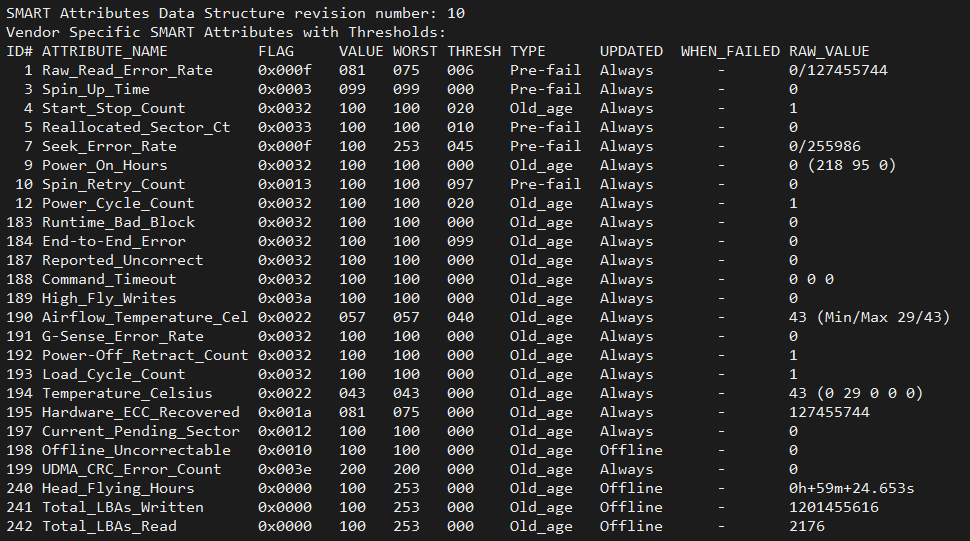 | SMART Attributes Data Structure revision number: 10 Vendor Specific SMART Attributes with Thresholds: ID# ATTRIBUTE_NAME FLAG VALUE WORST THRESH TYPE UPDATED WHEN_FAILED RAW_VALUE 1 Raw_Read_Error_Rate 0x000f 075 075 006 Pre-fail Always - 32421376 3 Spin_Up_Time 0x0003 099 099 000 Pre-fail Always - 0 4 Start_Stop_Count 0x0032 100 100 020 Old_age Always - 1 5 Reallocated_Sector_Ct 0x0033 100 100 010 Pre-fail Always - 0 7 Seek_Error_Rate 0x000f 100 253 045 Pre-fail Always - 235764 9 Power_On_Hours 0x0032 100 100 000 Old_age Always - 0 (33 156 0) 10 Spin_Retry_Count 0x0013 100 100 097 Pre-fail Always - 0 12 Power_Cycle_Count 0x0032 100 100 020 Old_age Always - 1 183 Runtime_Bad_Block 0x0032 100 100 000 Old_age Always - 0 184 End-to-End_Error 0x0032 100 100 099 Old_age Always - 0 187 Reported_Uncorrect 0x0032 100 100 000 Old_age Always - 0 188 Command_Timeout 0x0032 100 100 000 Old_age Always - 0 0 0 189 High_Fly_Writes 0x003a 100 100 000 Old_age Always - 0 190 Airflow_Temperature_Cel 0x0022 058 058 040 Old_age Always - 42 (Min/Max 29/42) 191 G-Sense_Error_Rate 0x0032 100 100 000 Old_age Always - 0 192 Power-Off_Retract_Count 0x0032 100 100 000 Old_age Always - 1 193 Load_Cycle_Count 0x0032 100 100 000 Old_age Always - 1 194 Temperature_Celsius 0x0022 042 042 000 Old_age Always - 42 (0 29 0 0 0) 195 Hardware_ECC_Recovered 0x001a 075 075 000 Old_age Always - 32421376 197 Current_Pending_Sector 0x0012 100 100 000 Old_age Always - 0 198 Offline_Uncorrectable 0x0010 100 100 000 Old_age Offline - 0 199 UDMA_CRC_Error_Count 0x003e 200 200 000 Old_age Always - 0 240 Head_Flying_Hours 0x0000 100 253 000 Old_age Offline - 0h+55m+20.747s 241 Total_LBAs_Written 0x0000 100 253 000 Old_age Offline - 1106421248 242 Total_LBAs_Read 0x0000 100 253 000 Old_age Offline - 2176 |