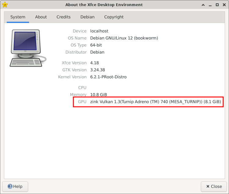 | root@localhost:~# glxinfo -B name of display: :0.0 display: :0 screen: 0 direct rendering: Yes Extended renderer info (GLX_MESA_query_renderer): Vendor: Mesa (0x5143) Device: zink Vulkan 1.3(Turnip Adreno (TM) 740 (MESA_TURNIP)) (0x43050a01) Version: 24.2.0 Accelerated: yes Video memory: 8271MB Unified memory: yes Preferred profile: core (0x1) Max core profile version: 4.6 Max compat profile version: 4.6 Max GLES1 profile version: 1.1 Max GLES[23] profile version: 3.2 Memory info (GL_ATI_meminfo): VBO free memory - total: 8269 MB, largest block: 8269 MB VBO free aux. memory - total: 0 MB, largest block: 0 MB Texture free memory - total: 8269 MB, largest block: 8269 MB Texture free aux. memory - total: 0 MB, largest block: 0 MB Renderbuffer free memory - total: 8269 MB, largest block: 8269 MB Renderbuffer free aux. memory - total: 0 MB, largest block: 0 MB Memory info (GL_NVX_gpu_memory_info): Dedicated video memory: 8271 MB Total available memory: 8271 MB Currently available dedicated video memory: 8269 MB OpenGL vendor string: Mesa OpenGL renderer string: zink Vulkan 1.3(Turnip Adreno (TM) 740 (MESA_TURNIP)) OpenGL core profile version string: 4.6 (Compatibility Profile) Mesa 24.2.0-devel (git-93f790b04a) OpenGL core profile shading language version string: 4.60 OpenGL core profile context flags: no-error OpenGL core profile profile mask: compatibility profile OpenGL version string: 4.6 (Compatibility Profile) Mesa 24.2.0-devel (git-93f790b04a) OpenGL shading language version string: 4.60 OpenGL context flags: no-error OpenGL profile mask: compatibility profile OpenGL ES profile version string: OpenGL ES 3.2 Mesa 24.2.0-devel (git-93f790b04a) OpenGL ES profile shading language version string: OpenGL ES GLSL ES 3.20 |