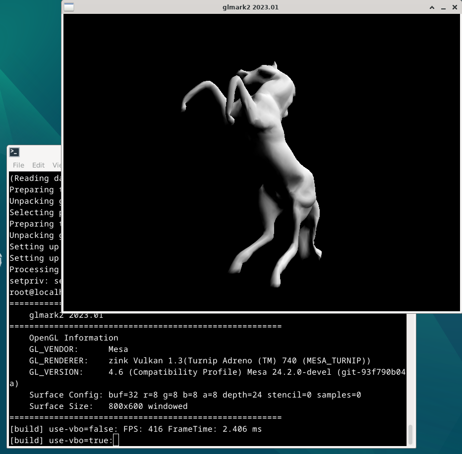 | root@localhost:~# apt install glmark2 root@localhost:~# glmark2 ======================================================= glmark2 2023.01 ======================================================= OpenGL Information GL_VENDOR: Mesa GL_RENDERER: zink Vulkan 1.3(Turnip Adreno (TM) 740 (MESA_TURNIP)) GL_VERSION: 4.6 (Compatibility Profile) Mesa 24.2.0-devel (git-93f790b04a) Surface Config: buf=32 r=8 g=8 b=8 a=8 depth=24 stencil=0 samples=0 Surface Size: 800x600 windowed ======================================================= [build] use-vbo=false: FPS: 416 FrameTime: 2.406 ms [build] use-vbo=true: FPS: 512 FrameTime: 1.956 ms [texture] texture-filter=nearest: FPS: 516 FrameTime: 1.940 ms [texture] texture-filter=linear: FPS: 496 FrameTime: 2.020 ms [texture] texture-filter=mipmap: FPS: 501 FrameTime: 1.998 ms [shading] shading=gouraud: FPS: 496 FrameTime: 2.019 ms [shading] shading=blinn-phong-inf: FPS: 492 FrameTime: 2.034 ms [shading] shading=phong: FPS: 463 FrameTime: 2.162 ms [shading] shading=cel: FPS: 487 FrameTime: 2.054 ms [bump] bump-render=high-poly: FPS: 419 FrameTime: 2.389 ms [bump] bump-render=normals: FPS: 496 FrameTime: 2.017 ms [bump] bump-render=height: FPS: 489 FrameTime: 2.048 ms [effect2d] kernel=0,1,0;1,-4,1;0,1,0;: FPS: 425 FrameTime: 2.354 ms [effect2d] kernel=1,1,1,1,1;1,1,1,1,1;1,1,1,1,1;: FPS: 346 FrameTime: 2.897 ms [pulsar] light=false:quads=5:texture=false: FPS: 270 FrameTime: 3.710 ms [desktop] blur-radius=5:effect=blur:passes=1:separable=true:windows=4: FPS: 282 FrameTime: 3.550 ms [desktop] effect=shadow:windows=4: FPS: 356 FrameTime: 2.809 ms [buffer] columns=200:interleave=false:update-dispersion=0.9:update-fraction=0.5:update-method=map: FPS: 247 FrameTime: 4.054 ms [buffer] columns=200:interleave=false:update-dispersion=0.9:update-fraction=0.5:update-method=subdata: FPS: 227 FrameTime: 4.407 ms [buffer] columns=200:interleave=true:update-dispersion=0.9:update-fraction=0.5:update-method=map: FPS: 267 FrameTime: 3.758 ms [ideas] speed=duration: FPS: 253 FrameTime: 3.963 ms [jellyfish] <default>: FPS: 358 FrameTime: 2.797 ms [terrain] <default>: FPS: 141 FrameTime: 7.129 ms [shadow] <default>: FPS: 358 FrameTime: 2.801 ms [refract] <default>: FPS: 184 FrameTime: 5.460 ms [conditionals] fragment-steps=0:vertex-steps=0: FPS: 434 FrameTime: 2.308 ms [conditionals] fragment-steps=5:vertex-steps=0: FPS: 445 FrameTime: 2.251 ms [conditionals] fragment-steps=0:vertex-steps=5: FPS: 458 FrameTime: 2.186 ms [function] fragment-complexity=low:fragment-steps=5: FPS: 463 FrameTime: 2.161 ms [function] fragment-complexity=medium:fragment-steps=5: FPS: 448 FrameTime: 2.232 ms [loop] fragment-loop=false:fragment-steps=5:vertex-steps=5: FPS: 452 FrameTime: 2.215 ms [loop] fragment-steps=5:fragment-uniform=false:vertex-steps=5: FPS: 446 FrameTime: 2.246 ms [loop] fragment-steps=5:fragment-uniform=true:vertex-steps=5: FPS: 446 FrameTime: 2.244 ms ======================================================= glmark2 Score: 395 ======================================================= root@localhost:~# |