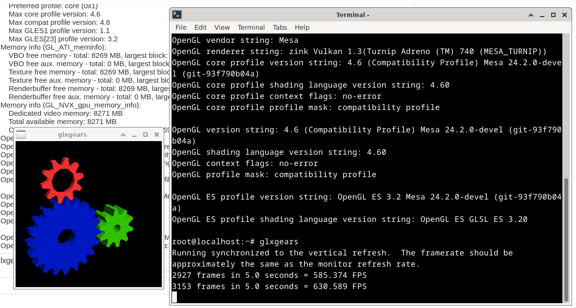 | root@localhost:~# glxinfo -B name of display: :0.0 display: :0 screen: 0 direct rendering: Yes Extended renderer info (GLX_MESA_query_renderer): Vendor: Mesa (0x5143) Device: zink Vulkan 1.3(Turnip Adreno (TM) 740 (MESA_TURNIP)) (0x43050a01) Version: 24.2.0 Accelerated: yes Video memory: 8271MB Unified memory: yes Preferred profile: core (0x1) Max core profile version: 4.6 Max compat profile version: 4.6 Max GLES1 profile version: 1.1 Max GLES[23] profile version: 3.2 Memory info (GL_ATI_meminfo): VBO free memory - total: 8269 MB, largest block: 8269 MB VBO free aux. memory - total: 0 MB, largest block: 0 MB Texture free memory - total: 8269 MB, largest block: 8269 MB Texture free aux. memory - total: 0 MB, largest block: 0 MB Renderbuffer free memory - total: 8269 MB, largest block: 8269 MB Renderbuffer free aux. memory - total: 0 MB, largest block: 0 MB Memory info (GL_NVX_gpu_memory_info): Dedicated video memory: 8271 MB Total available memory: 8271 MB Currently available dedicated video memory: 8269 MB OpenGL vendor string: Mesa OpenGL renderer string: zink Vulkan 1.3(Turnip Adreno (TM) 740 (MESA_TURNIP)) OpenGL core profile version string: 4.6 (Compatibility Profile) Mesa 24.2.0-devel (git-93f790b04a) OpenGL core profile shading language version string: 4.60 OpenGL core profile context flags: no-error OpenGL core profile profile mask: compatibility profile OpenGL version string: 4.6 (Compatibility Profile) Mesa 24.2.0-devel (git-93f790b04a) OpenGL shading language version string: 4.60 OpenGL context flags: no-error OpenGL profile mask: compatibility profile OpenGL ES profile version string: OpenGL ES 3.2 Mesa 24.2.0-devel (git-93f790b04a) OpenGL ES profile shading language version string: OpenGL ES GLSL ES 3.20 |