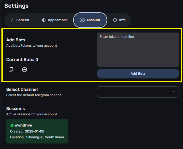 어카운트 메뉴로 이동하여 봇토큰을 넣어줍니다.